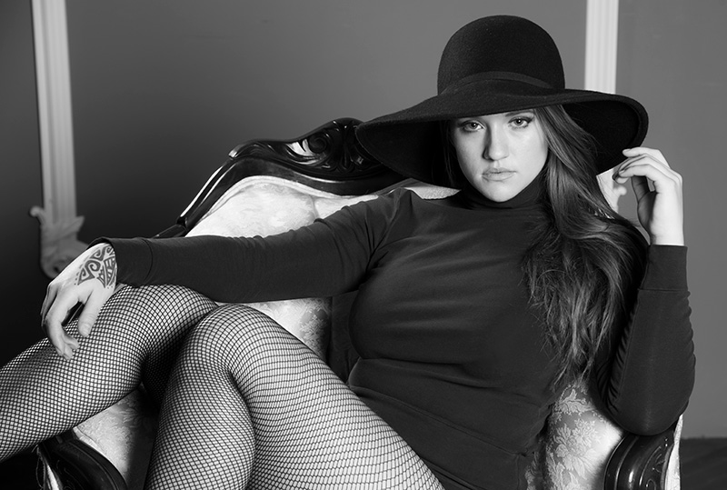 Olivia came to the studio after my girlfriend showed her some of my work. She is easy to work with, and learning fast. My favorite shots with Olivia are with the hat; and I am so glad she brought it. However, she rocked lingerie and a couple of outfits, too. Olivia’s womanly curves made glamour easy.